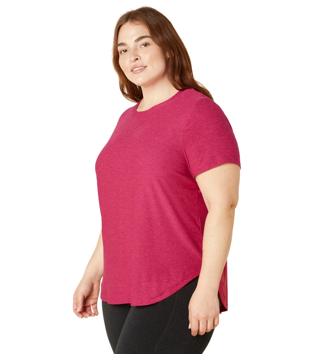 The Beyond Yoga Plus Size Featherweight On The Down Low Tee is a relaxed tee made from incredibly soft and lightweight, Featherweight Spacedye fabric. Complete with a curved hem, short sleeves, and long length for more coverage. Wear it with your favorite leggings or jeans for everyday style.