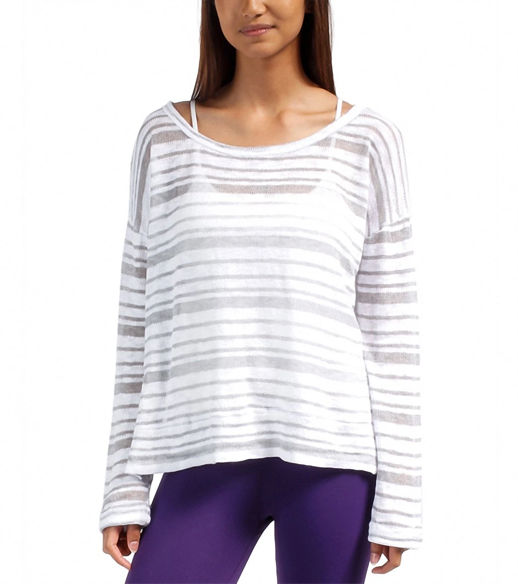 - Keywords: pullover, long sleeve, striped, scoop neckline, side slits, dropped sleeve, white, grey, sheer, lightweight